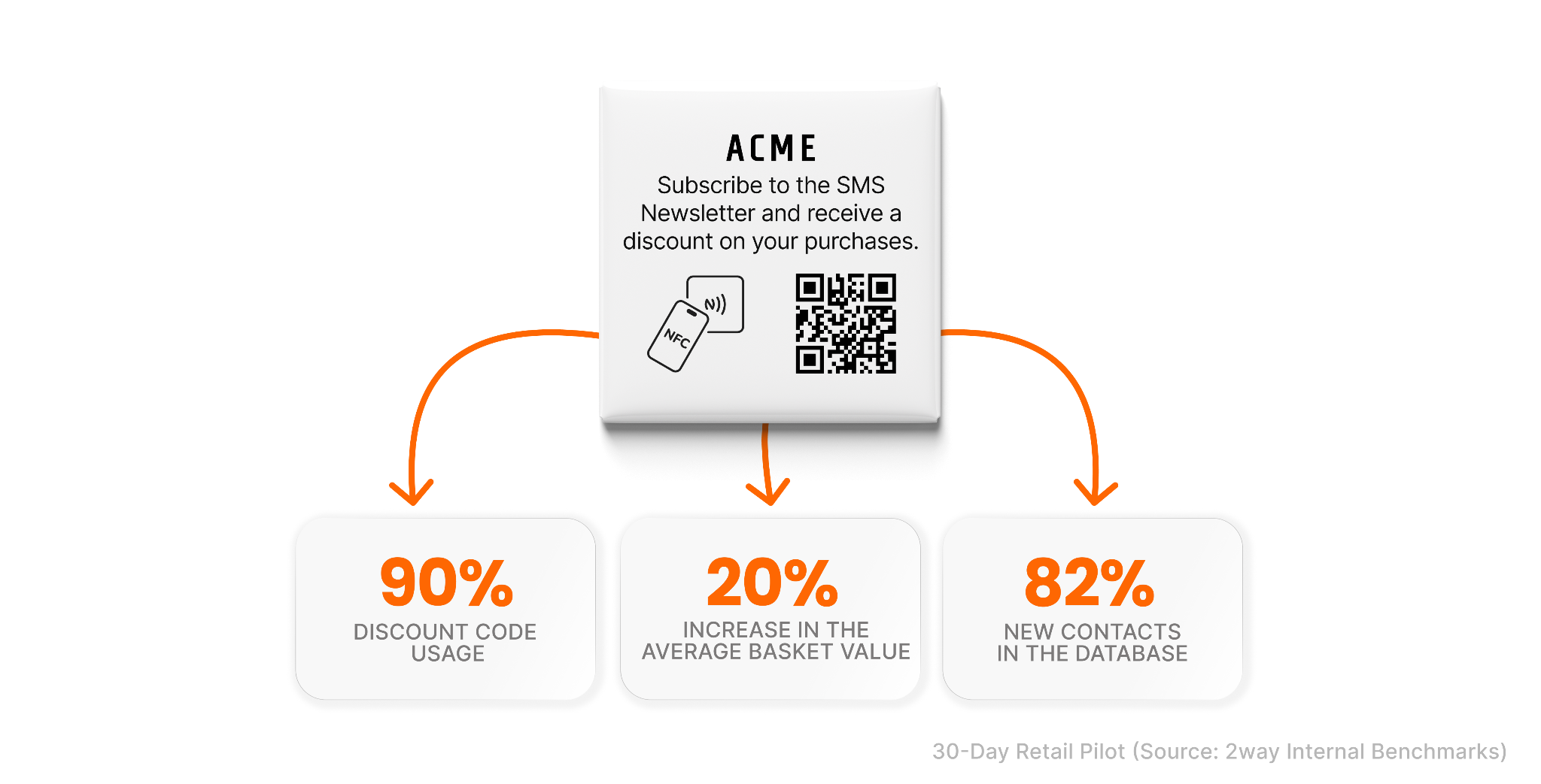 An international clothing retailer running hundreds of stores spent years knowing how many people walked through the door. Most of those visits left no contact detail the brand could act on. After a 30-day pilot of 2way Grow using NFC and QR stickers with verified phone opt-ins, they had thousands of new contacts, 90 percent discount code usage, and a 20 percent increase in average basket value.
