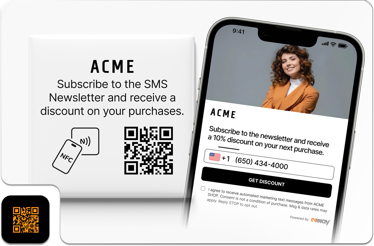 The mechanism uses NFC and QR stickers provided by 2way as part of the 2way Grow deployment. Each sticker contains a built-in NFC chip and a printed QR code, and arrives ready to place with no technical setup required on the brand's side. NFC works like contactless payment: the customer holds their phone near the sticker and a sign-up page opens automatically on their screen. The QR code does the same for customers who prefer to scan. No app download, no loyalty card, no form at the counter.