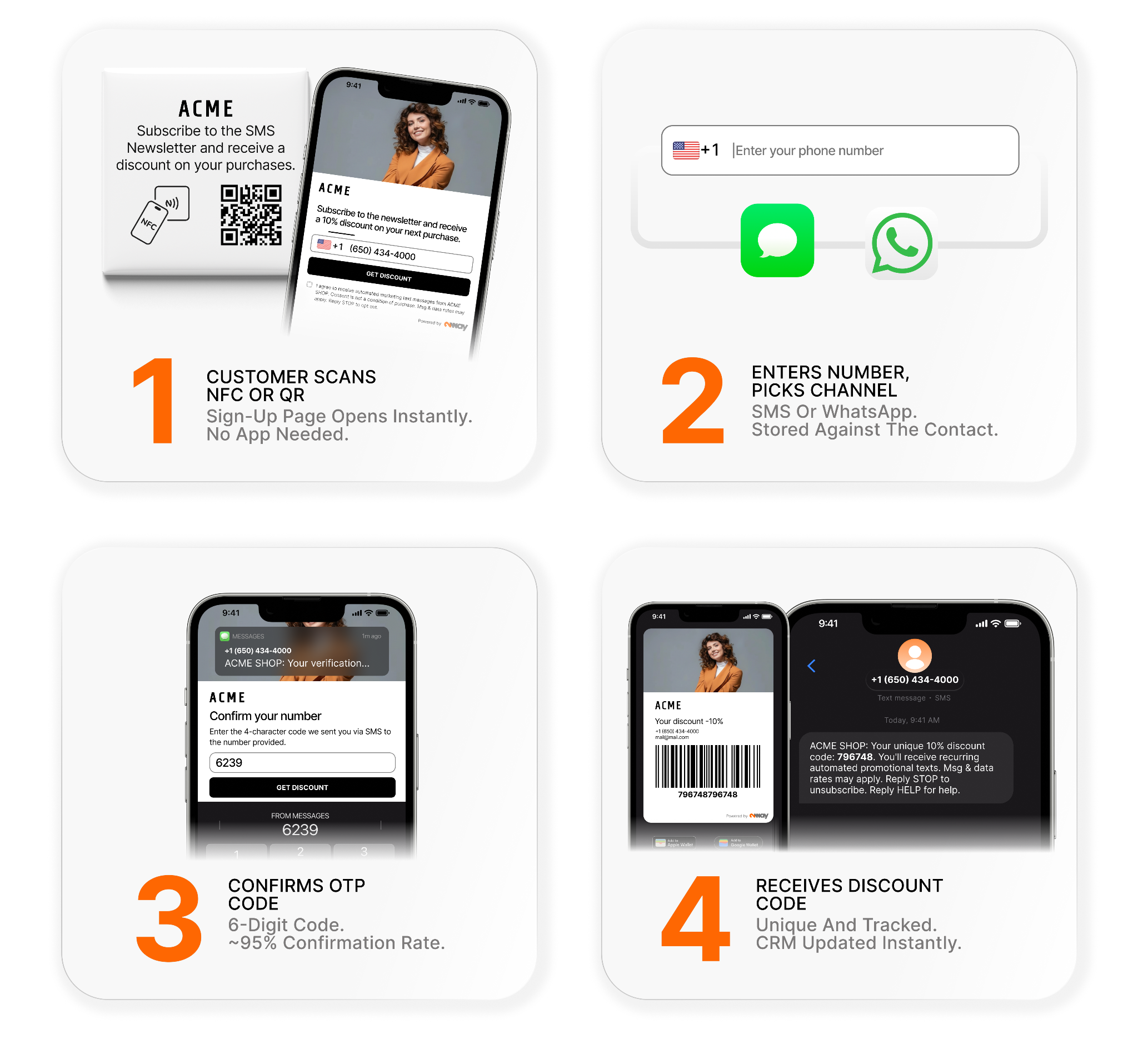 The customer enters their phone number, chooses their preferred channel (SMS or WhatsApp), and confirms a six-digit one-time passcode (OTP) sent to their device. That OTP step is not optional. It is built into the collection mechanism itself, which means every contact added to the database has confirmed their number was real and their device was in their hands at that moment. The OTP confirmation rate sits at approximately 95 percent.